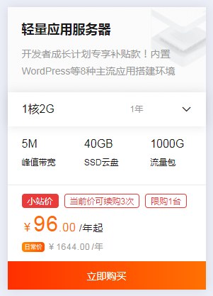 阿里云ECS到期,这次我以96元的价格购置了阿里云的轻量应用服务器1年,带宽5M,1核CPU,2GB内存,40G SSD云盘,对我来说完全够用了。
